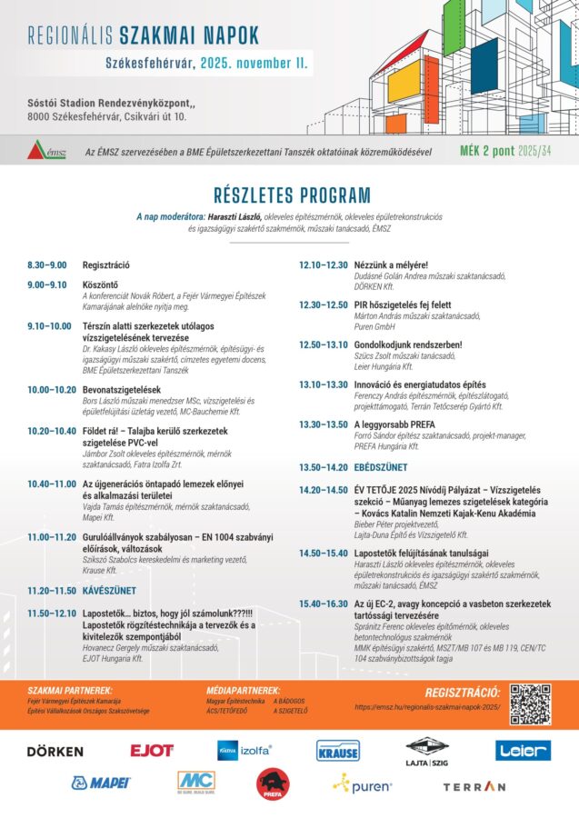 Szövetségünk a BME Épületszerkezettani Tanszék szakmai támogatásával és oktatóinak közreműködésével 2025-ben is megszervezi a Regionális Szakmai Napok rendezvénysorozatot. 2025. november 11. kedd, Székesfehérvár MÉK 2 pont 2025/34 RÉSZLETES PROGRAM Forrás:https://emsz.hu/regionalis-szakmai-napok-2025/