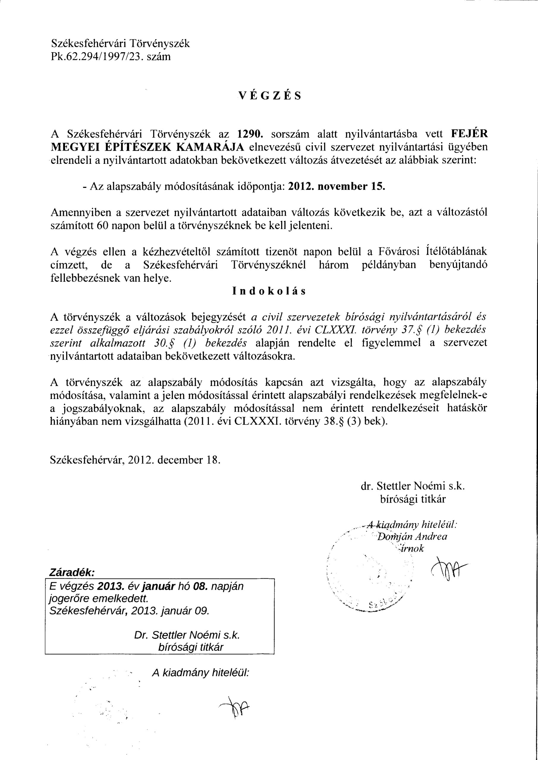 A Székesfehérvári Törvényszék az alapszabály átvezetését 2024.12.19.-én megtette. Erről a végzést csatolva.